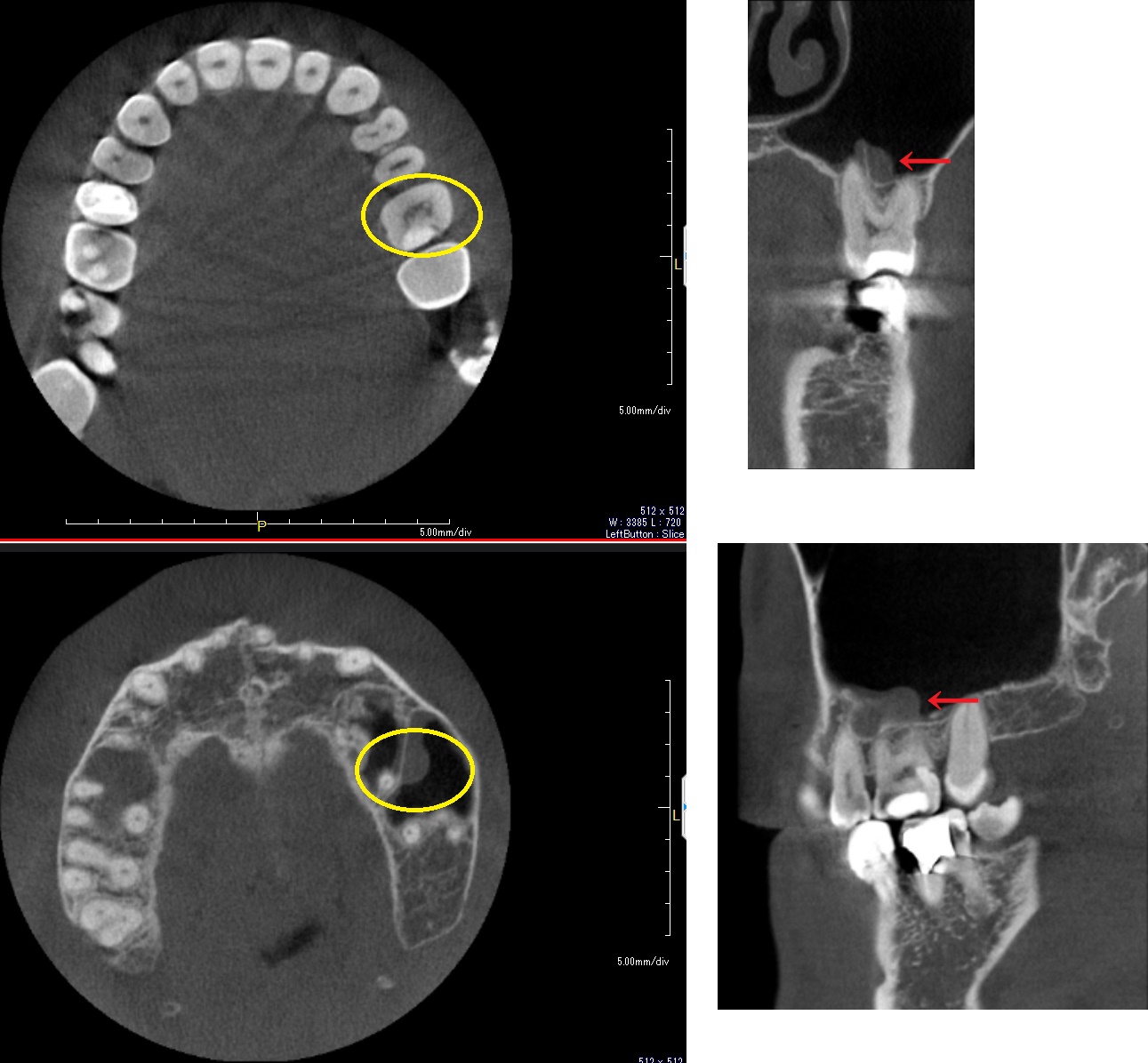 向かって左側の大きな肥厚は右上5番歯によるものです。