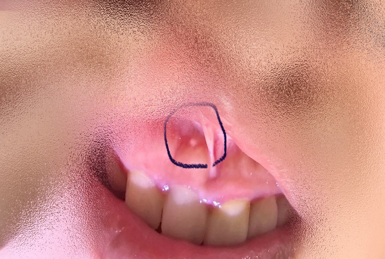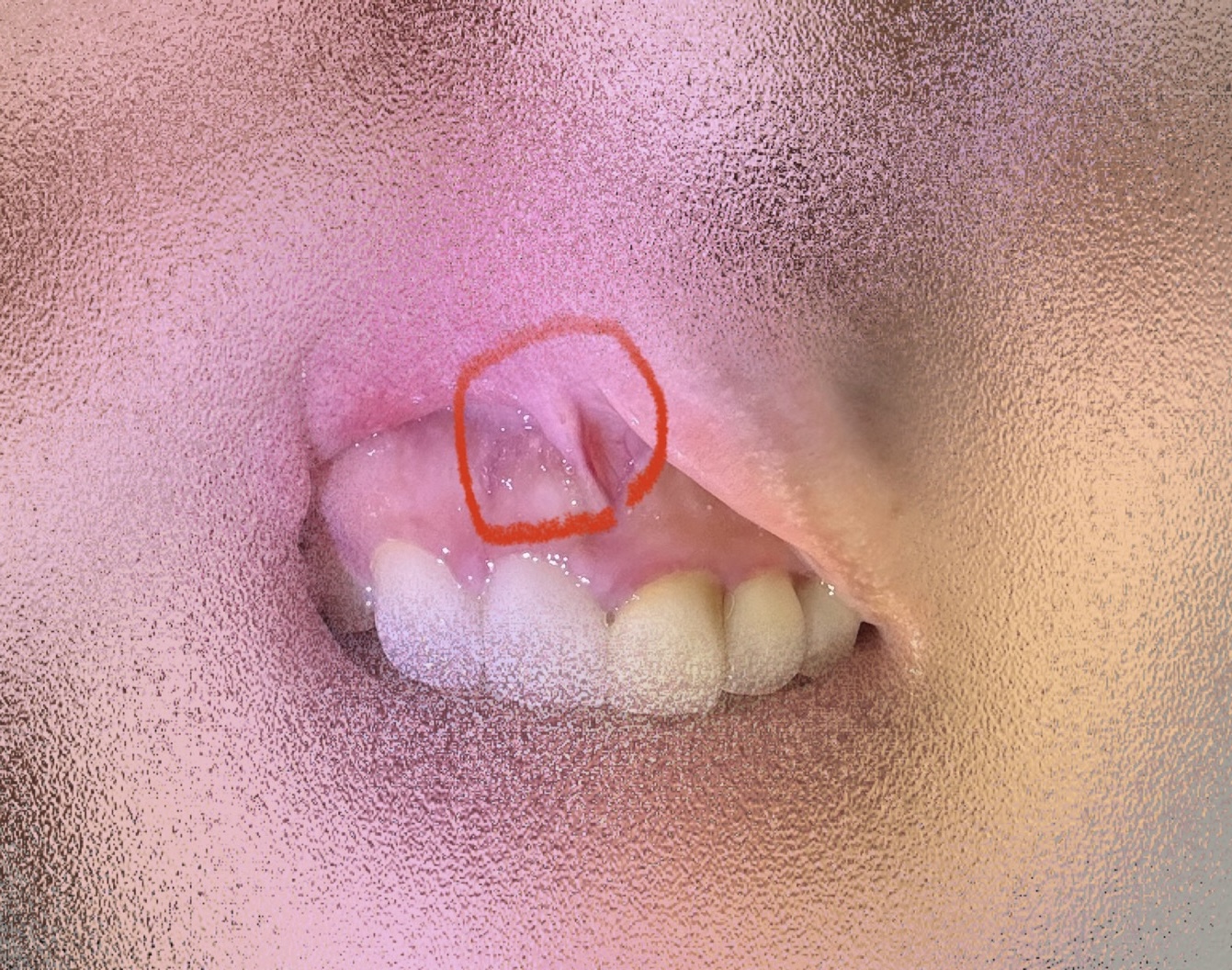2日前に唇の裏が炎症を起こしており、唇をめくった際に前歯の歯茎に白い点があるのを見つけました。