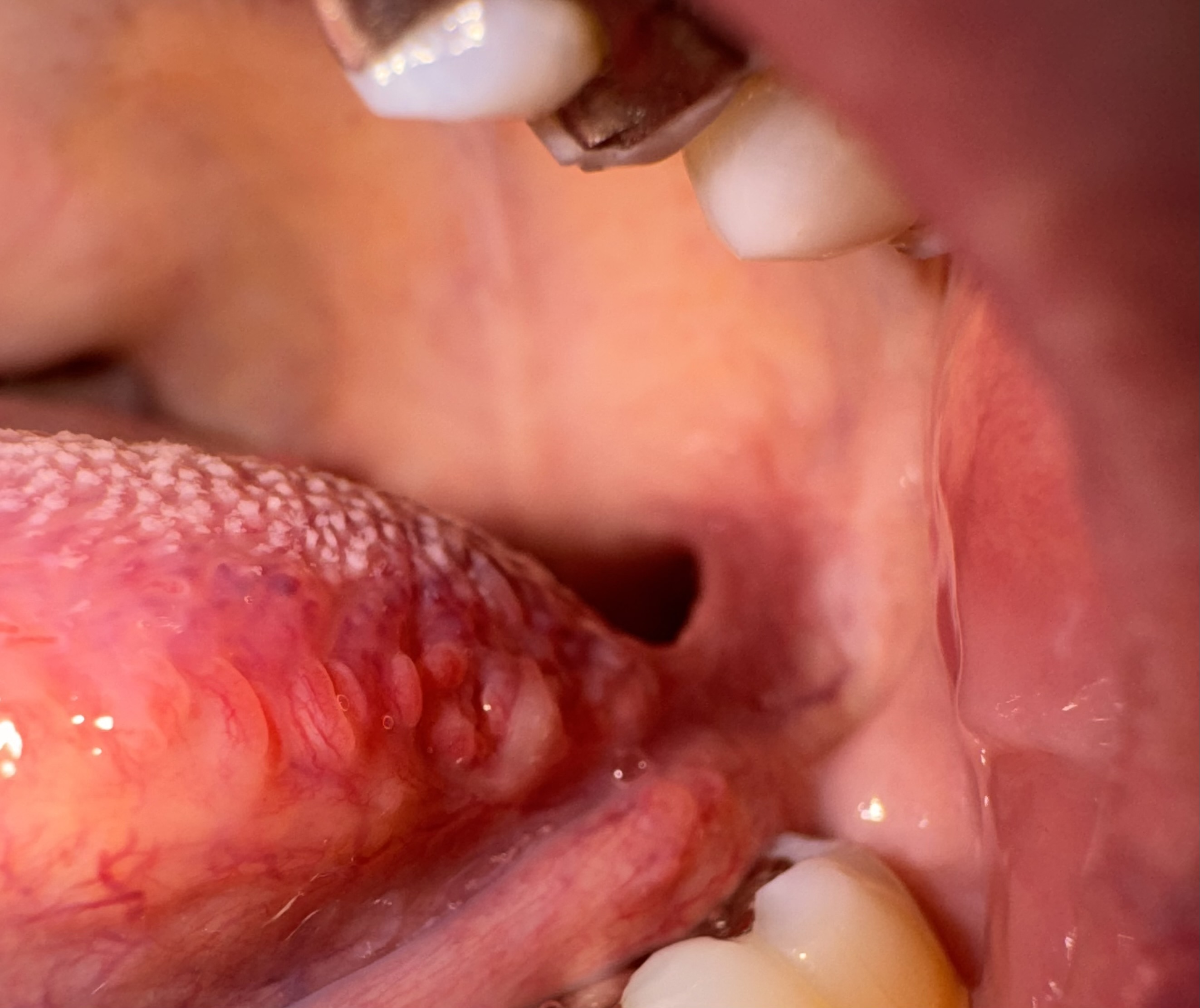 舌の裏側に違和感があり、リンパ腺の腫れとしこりのようなものがあります。