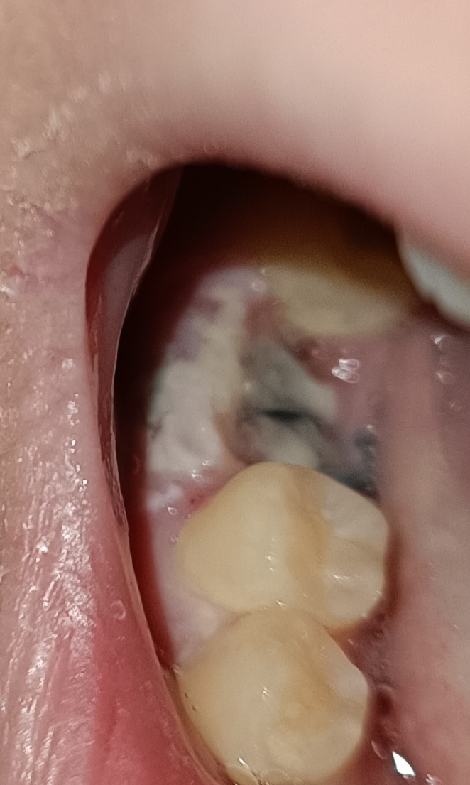 虫歯の抜歯後、腫れが治まらず、歯茎に白いものが広がっています。