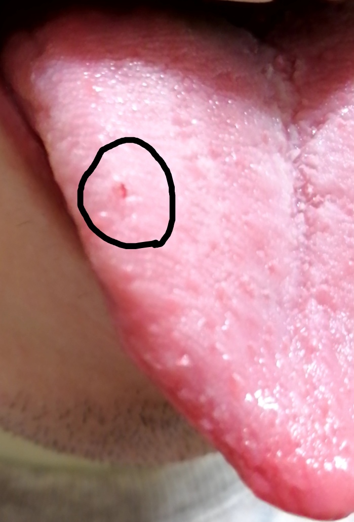 鏡を見たら舌の黒い線で囲んだところに何かなってます。