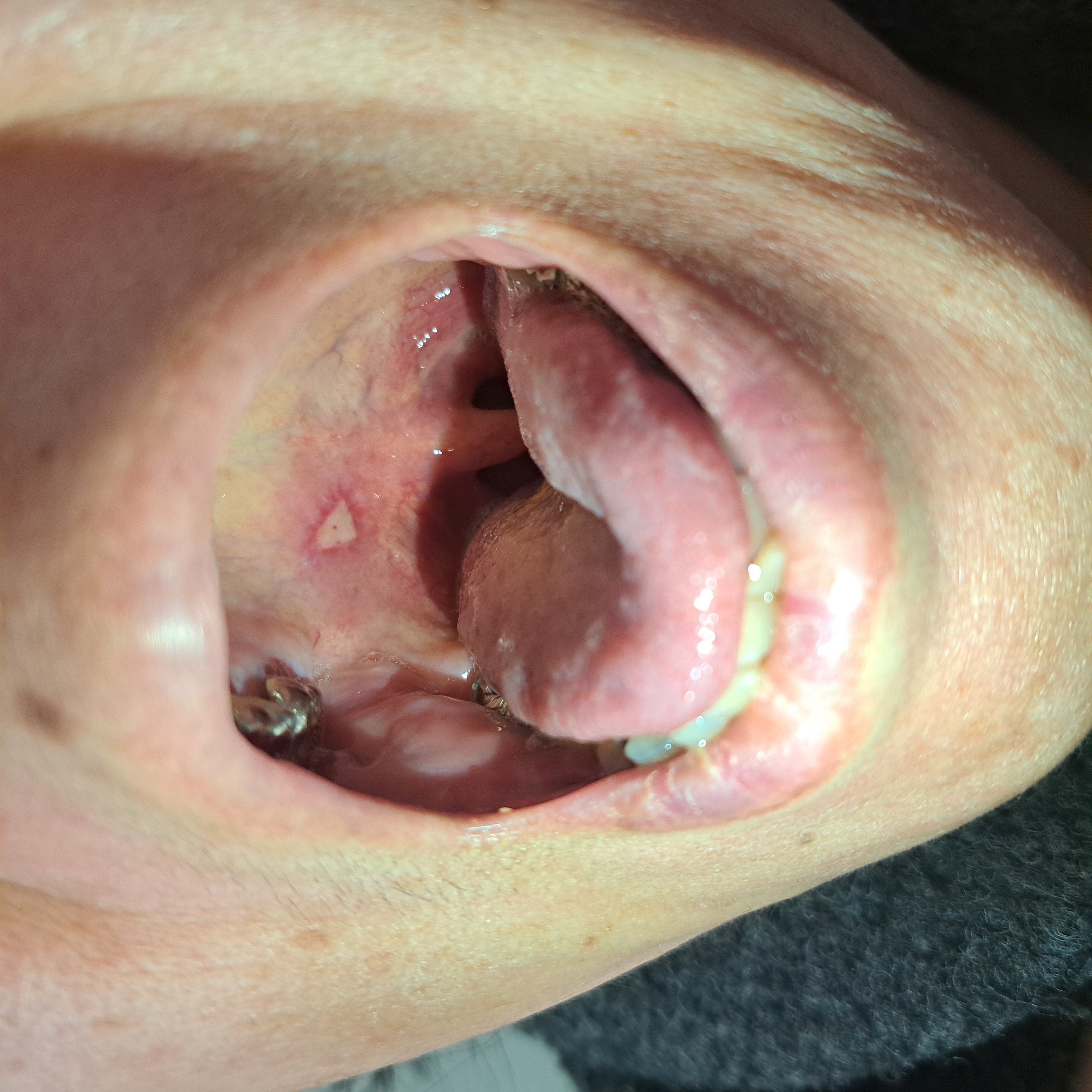 その後どうしても食品が通過するので痛みがあり、赤くなっていましたが、今朝見たら大きい白い口内炎のようになっていて周辺が赤くなっています。