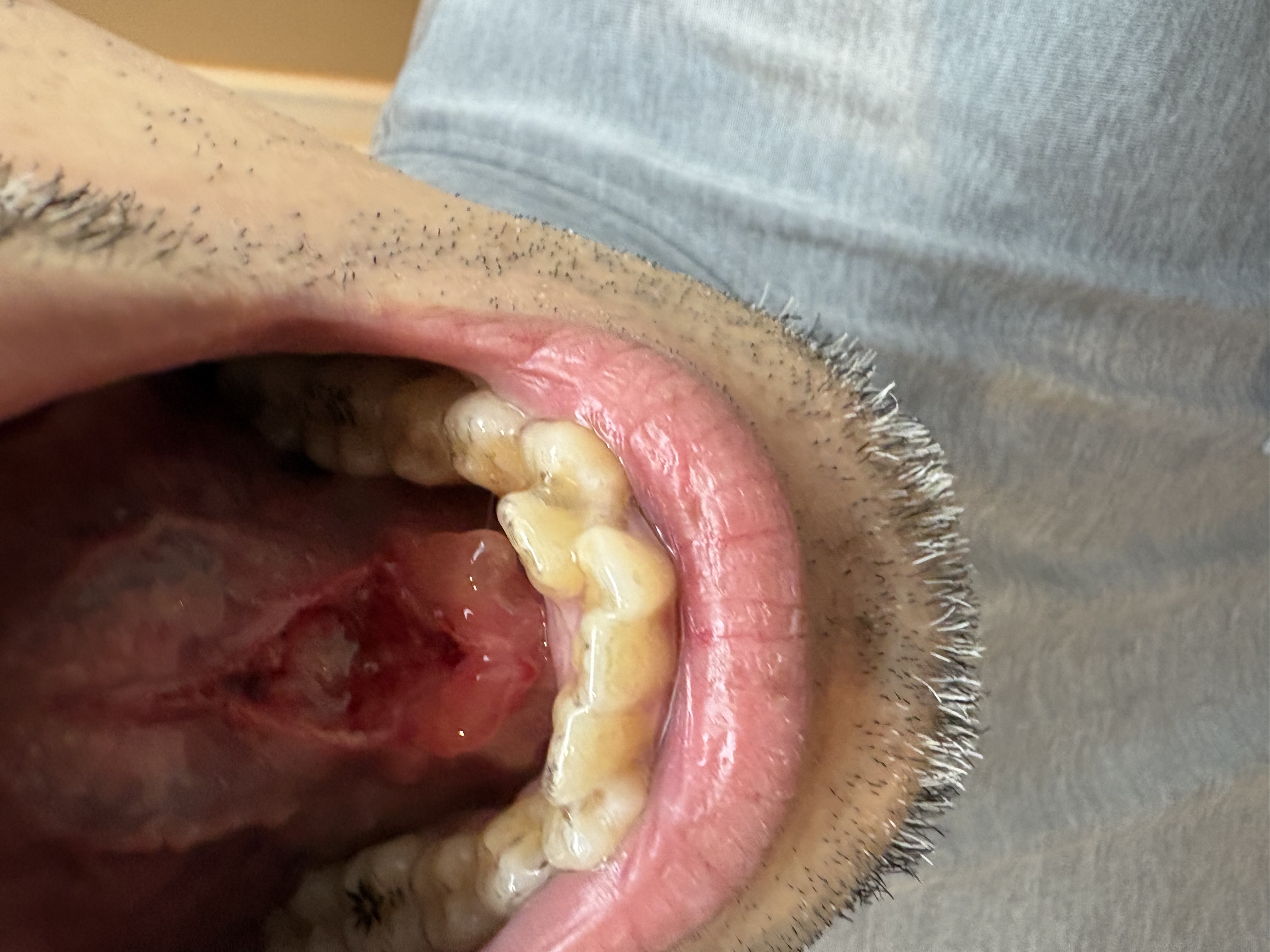 歯茎が膿んだところが腫れて、頬が垂れ下がったようになっています。