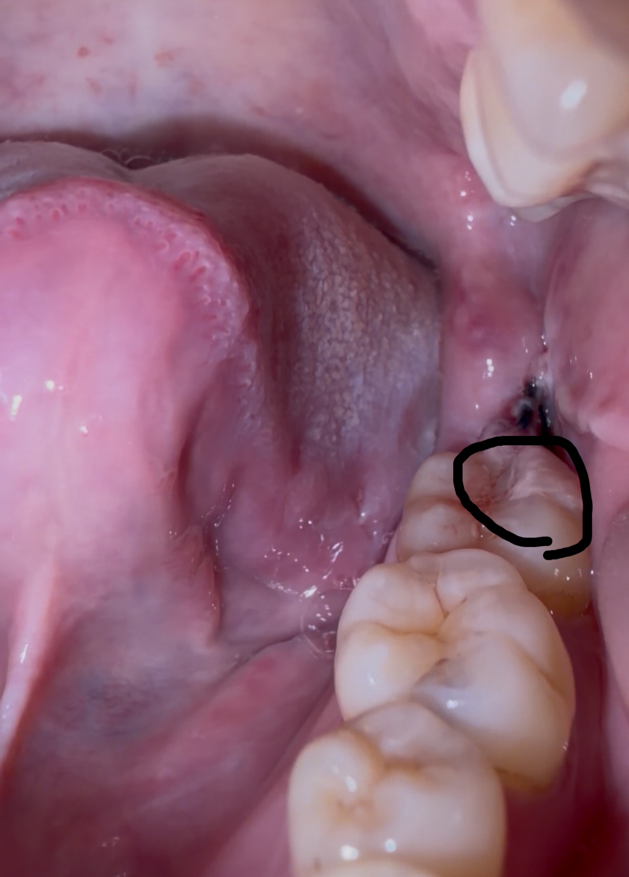 親知らず抜歯4日後なのですが、写真の黒丸のような白い柔らかそうなものが横の歯や抜歯したところにいたりするのですが、これは正常な過程でしょうか?